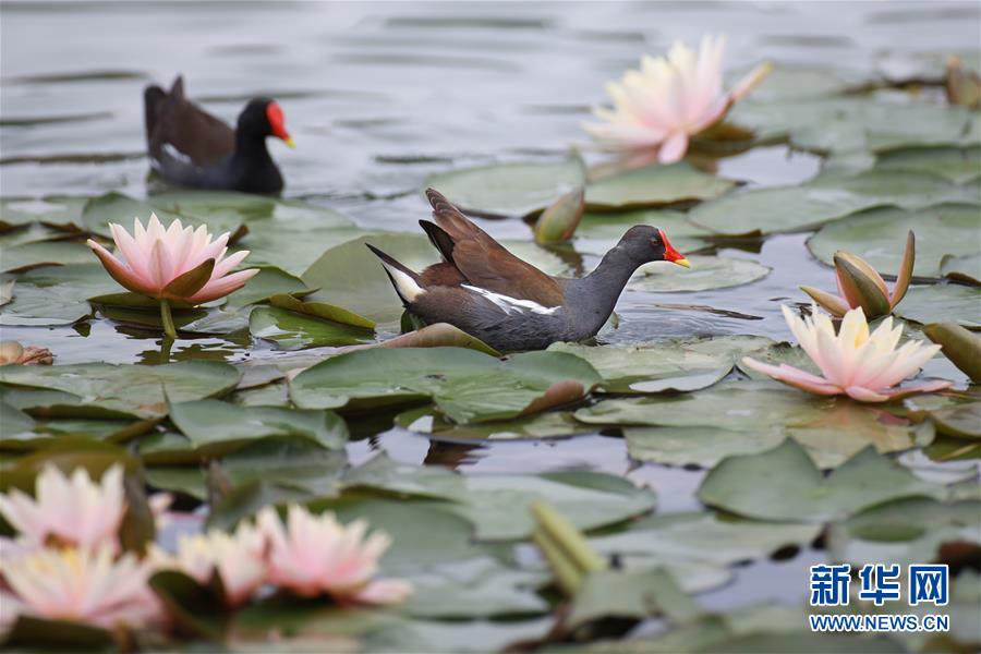 5月22日,两只红嘴水鸡在莲叶间游弋。近日,贵阳市观山湖公园内大片盛开的莲花吸引了不少水鸟在其间嬉戏觅食。新华社记者刘续摄
