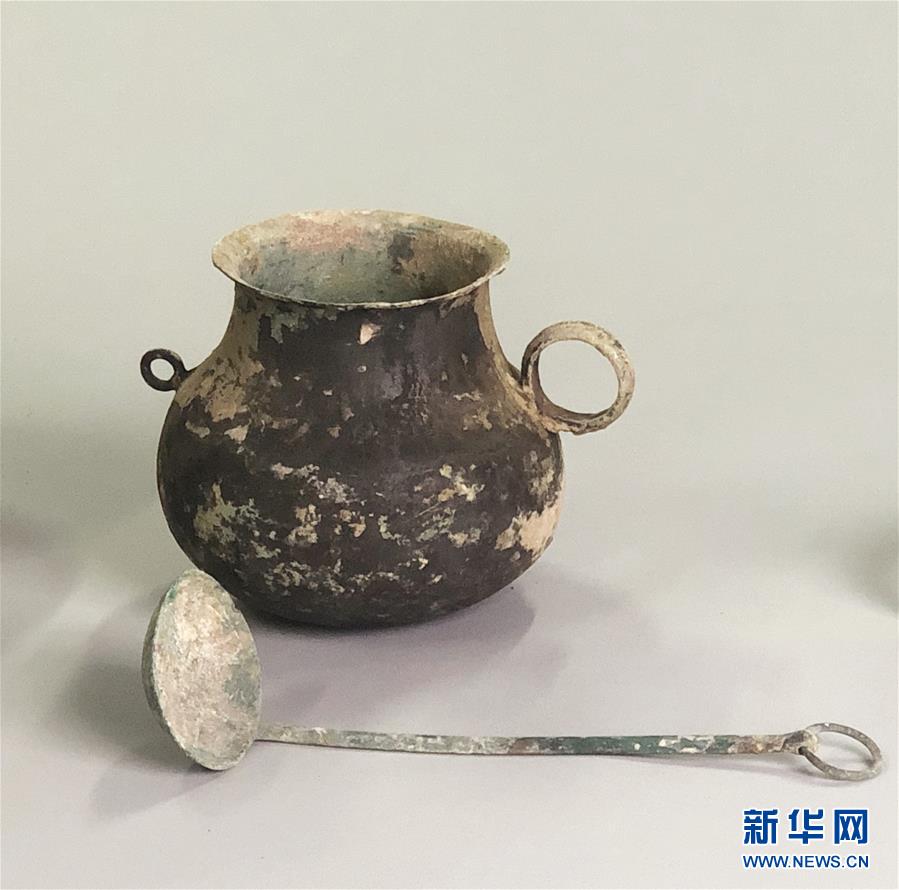 发掘出土的铜鍪与铜勺(5月22日摄)。新华社记者李丽静摄
