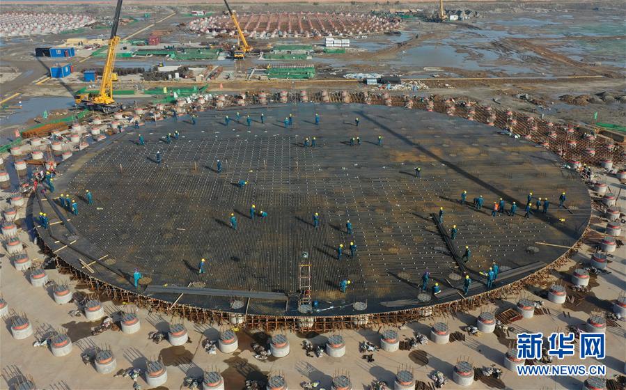 5月23日,工人在唐山市曹妃甸区LNG项目第一阶段工程储罐建设工地施工(无人机照片)。新华社记者杨世尧摄