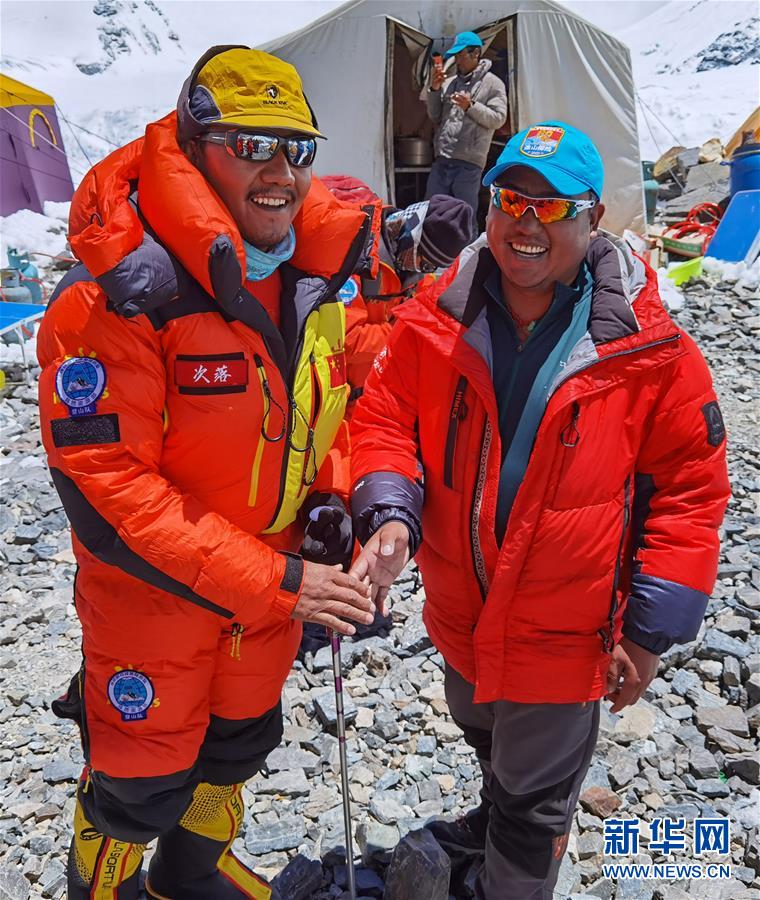 5月24日,2020珠峰高程测量登山队副队长桑珠(右)和冲顶组组长次落(左)在海拔6500米的前进营地。新华社特约记者拉巴摄