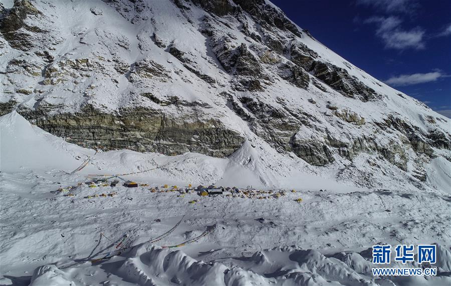 位于珠峰东绒布冰川旁海拔6500米的珠峰前进营地(5月22日摄,无人机照片)。新华社记者晋美多吉摄
