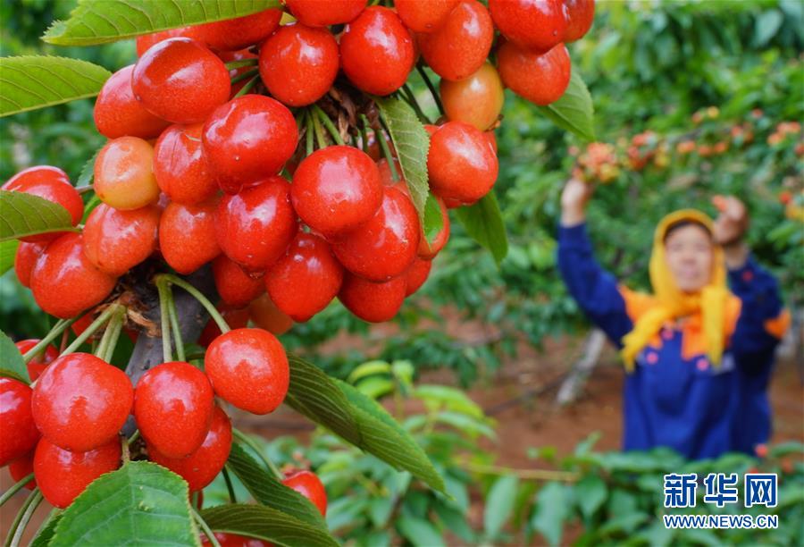 5月24日,滦州市九百户镇鸡冠山生态产业园的工人在采摘大樱桃。新华社记者杨世尧摄