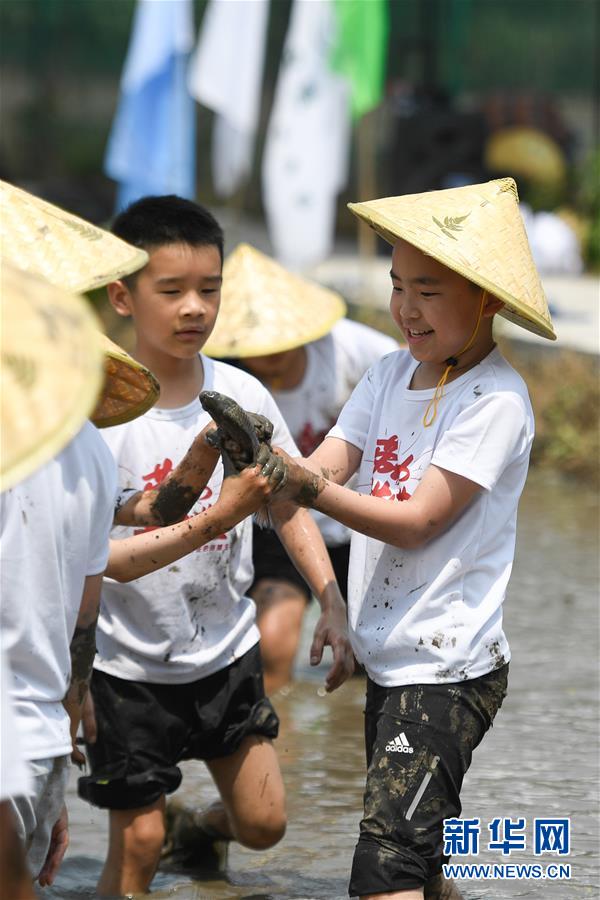 5月24日,小朋友在稻田里捉鱼,体验农事。当日,十余名小朋友在家长的带领下来到浙江省湖州市吴兴区八里店镇尹家圩粮油植保农机专业合作社的稻田中,参加亲子插秧、稻田捉鱼等农事体验活动。新华社记者黄宗治摄