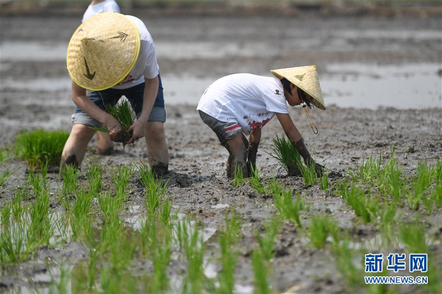 5月24日,一名小朋友在稻田里插秧。当日,十余名小朋友在家长的带领下来到浙江省湖州市吴兴区八里店镇尹家圩粮油植保农机专业合作社的稻田中,参加亲子插秧、稻田捉鱼等农事体验活动。新华社记者黄宗治摄