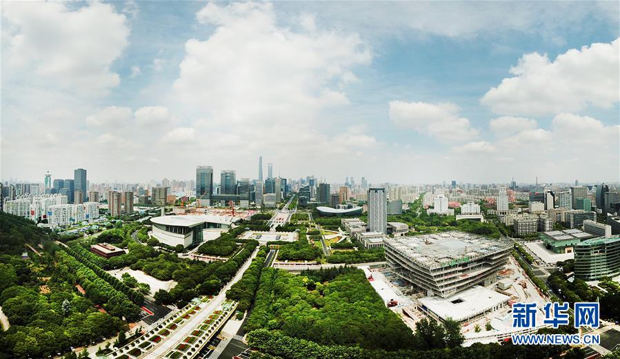 从空中俯瞰建设中的上海图书馆东馆(右)及其所在区域(无人机照片,5月22日摄)。 新华社记者 方喆 摄