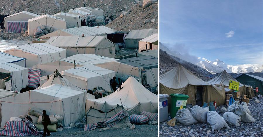 拼版照片:左图为2005年的春季登山季,为测量、登山和科考等队伍提供服务保障的当地群众在珠峰大本营搭起的帐篷(资料照片)。新华社记者索朗罗布摄右图为2020珠峰高程测量活动中,曾经被视为登山队最好的帐篷变成了垃圾集中存放处。新华社记者普布扎西摄