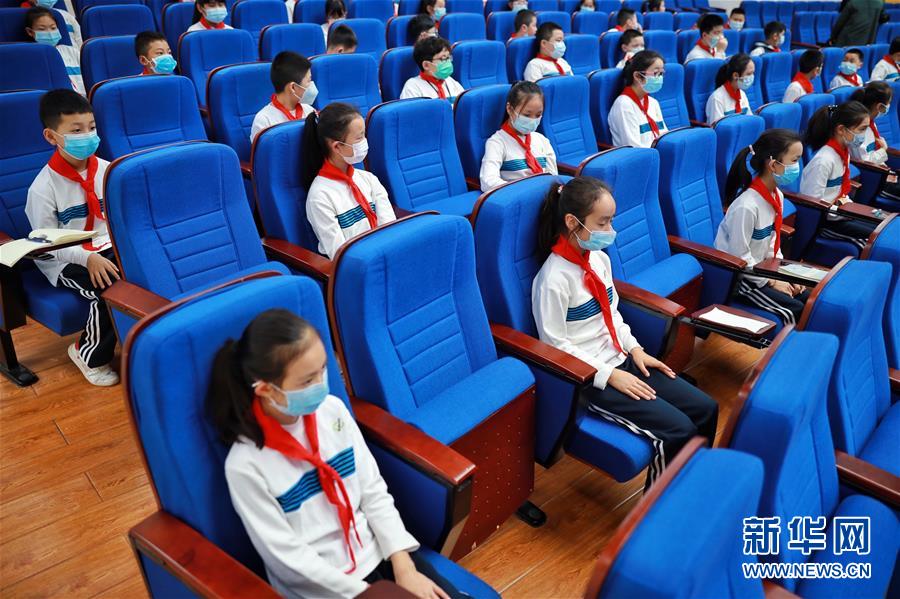 5月25日,广州市荔湾区蒋光鼐纪念小学的学生在参加升国旗唱国歌仪式。当日,广州市各小学一至三年级学生正式开学复课。至此,广州市中小学各年级已全部开学复课。新华社记者卢汉欣摄