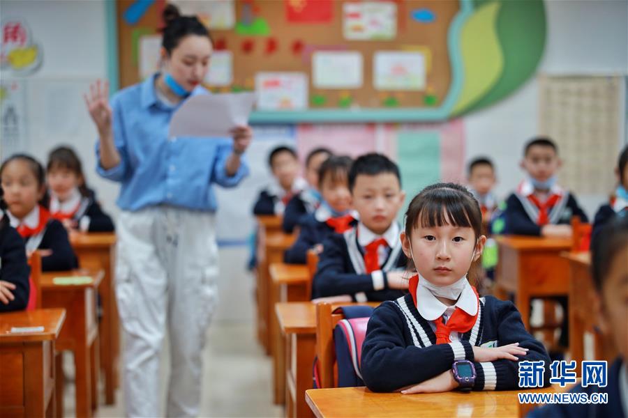 5月25日,广州市荔湾区蒋光鼐纪念小学的老师在给学生上开学第一课。当日,广州市各小学一至三年级学生正式开学复课。至此,广州市中小学各年级已全部开学复课。新华社记者卢汉欣摄