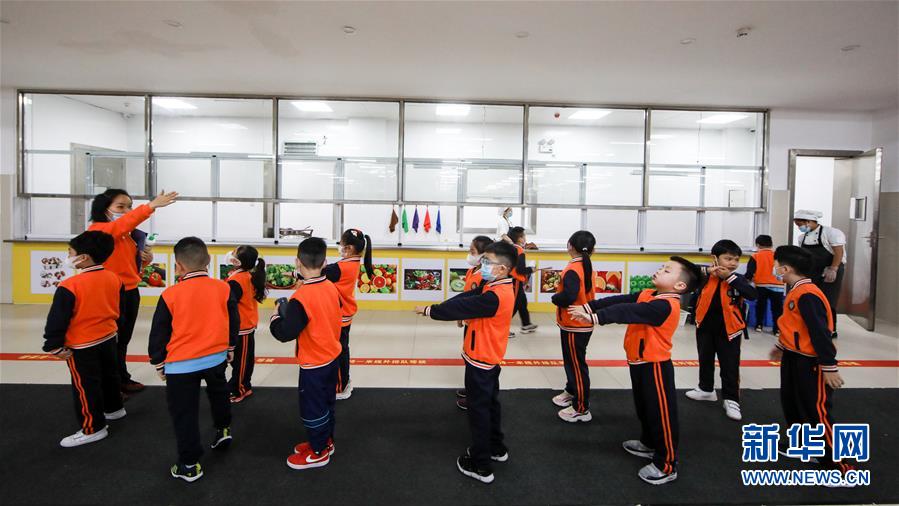 5月25日,广州市荔湾区蒋光鼐纪念小学的老师在教学生防疫知识。当日,广州市各小学一至三年级学生正式开学复课。至此,广州市中小学各年级已全部开学复课。新华社记者卢汉欣摄