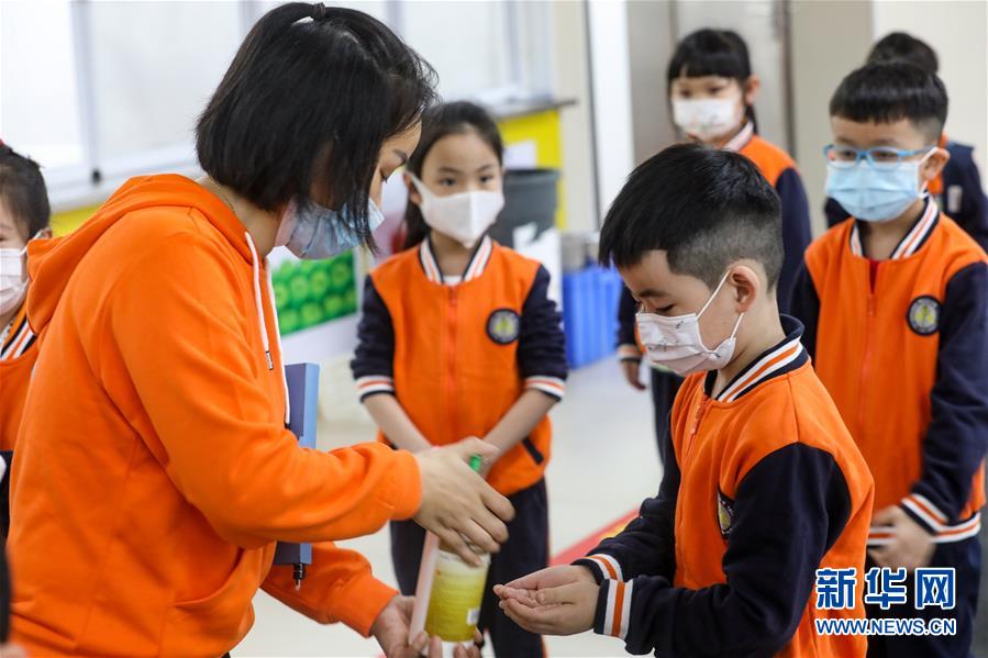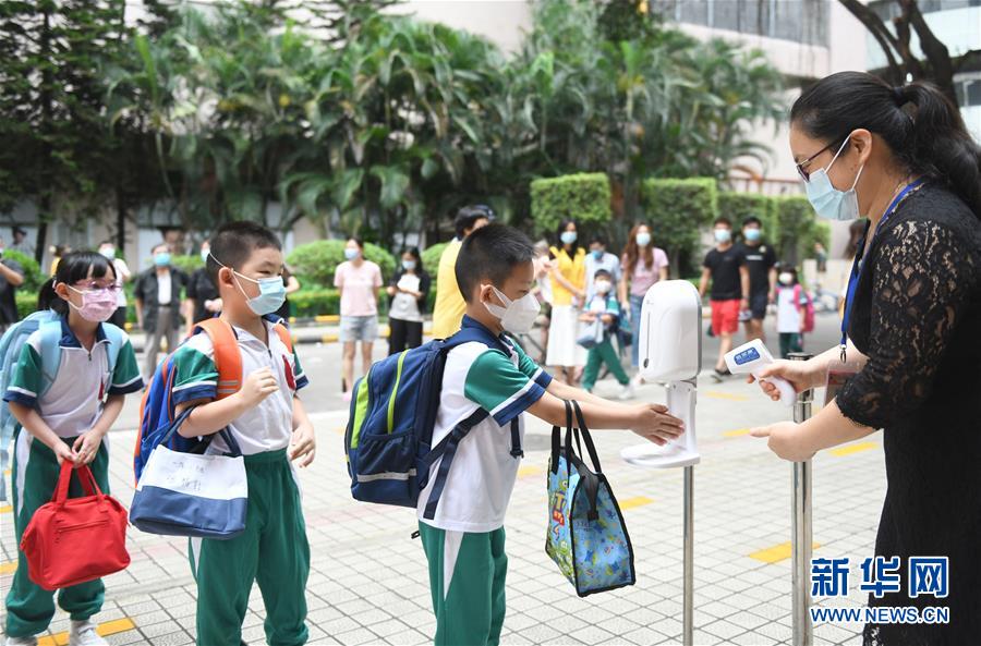 5月25日,广州市荔湾区蒋光鼐纪念小学的老师在校门口指导返校的学生进行手部消毒。当日,广州市各小学一至三年级学生正式开学复课。至此,广州市中小学各年级已全部开学复课。新华社记者卢汉欣摄