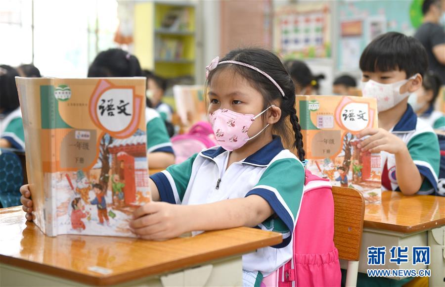 5月25日,广州市荔湾区蒋光鼐纪念小学的学生在朗读。当日,广州市各小学一至三年级学生正式开学复课。至此,广州市中小学各年级已全部开学复课。新华社记者卢汉欣摄