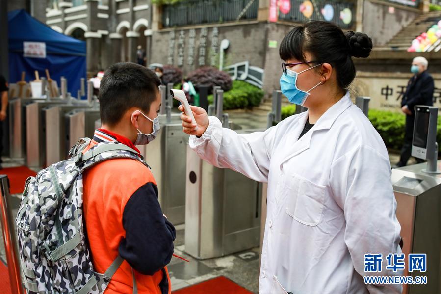 5月25日,贵阳市中天北京小学未来方舟校区学生在返校时进行体温检测。新华社记者欧东衢摄