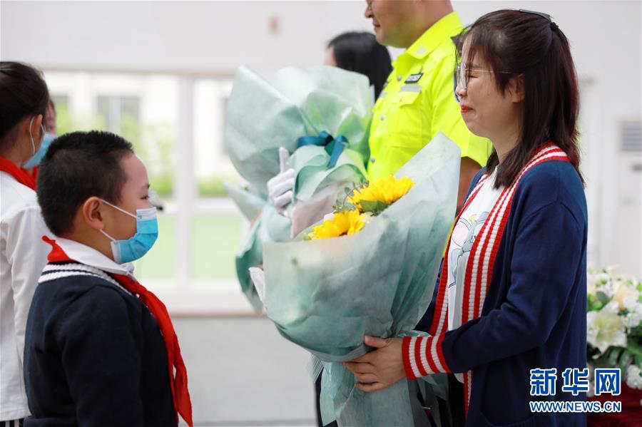 5月25日,北京市朝阳区实验小学贵阳分校的学生在上开学第一课时,为前来讲课的抗疫医生送上鲜花。新华社记者刘续摄