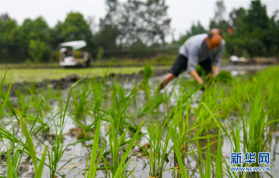 5月26日,都江堰市聚源镇笆桥社区农民在水田里插秧。初夏时节,四川省都江堰市聚源镇笆桥社区农民抢抓农时插秧,田间地头一派繁忙的景象。新华社记者王曦摄