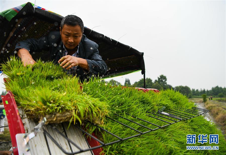 5月26日,都江堰市聚源镇笆桥社区的农技人员驾驶插秧机插秧。初夏时节,四川省都江堰市聚源镇笆桥社区农民抢抓农时插秧,田间地头一派繁忙的景象。新华社记者王曦摄