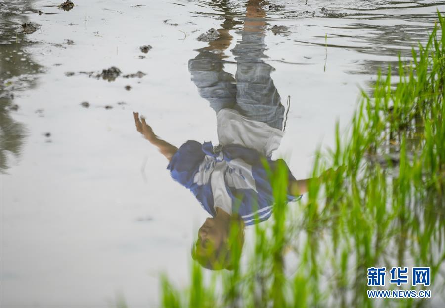 5月26日,都江堰市聚源镇笆桥社区农民在水田里插秧。初夏时节,四川省都江堰市聚源镇笆桥社区农民抢抓农时插秧,田间地头一派繁忙的景象。新华社记者王曦摄