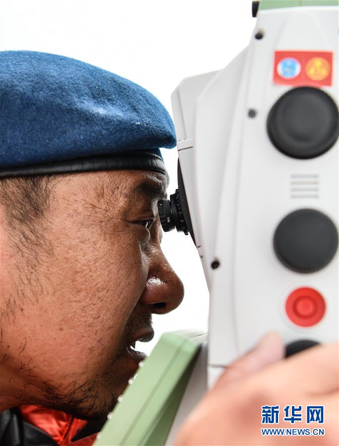 自然资源部第一大地测量队队员郑林在使用全站仪对珠峰峰顶进行交会观测(5月27日摄)。新华社记者晋美多吉摄
