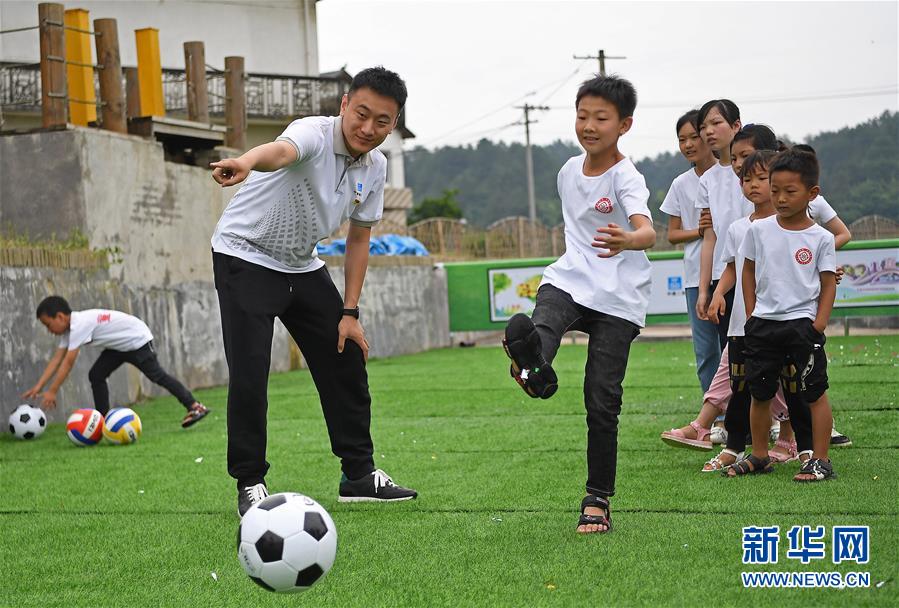 5月27日,在江西省贵溪市金屯镇金屯村渡坊村小组,志愿者和留守儿童一起进行体育活动。新华社记者万象摄