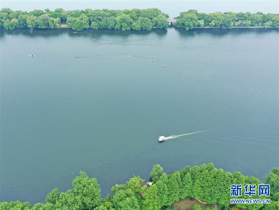 5月27日,船只在西湖上行驶(无人机照片)。随着气温升高,杭州西湖绿意葱茏,展现出柔美的湖光山色。新华社记者翁忻旸摄