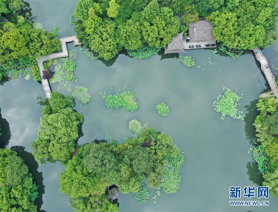 5月27日,游人在西湖曲院风荷景区游览(无人机照片)。随着气温升高,杭州西湖绿意葱茏,展现出柔美的湖光山色。新华社记者翁忻旸摄