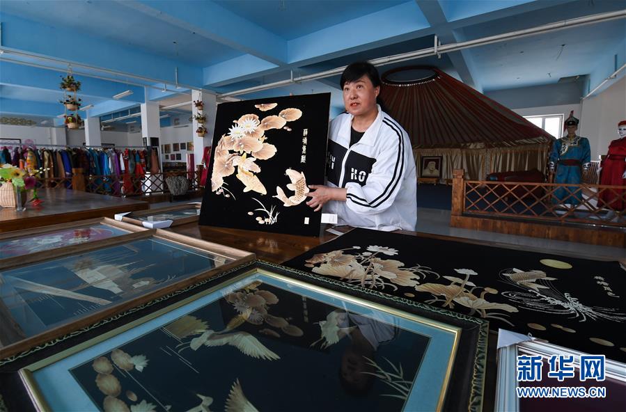 5月19日,在新疆博湖县,一家民族工艺品公司的负责人杜玉新向参观者介绍芦苇工艺画的制作工艺。新华社记者宋彦桦摄