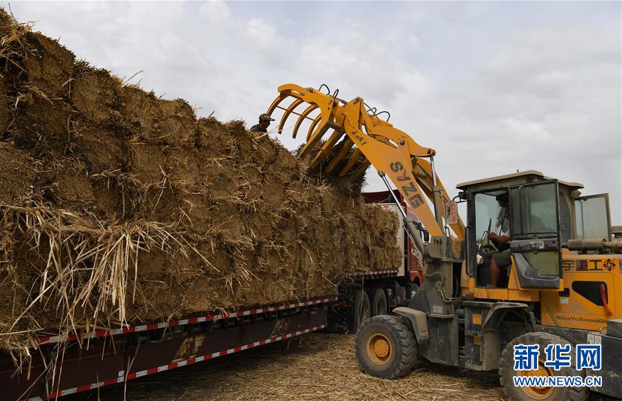 5月20日,在新疆博湖县西南河口苇场,工人将打包成捆的芦苇装车。新华社记者宋彦桦摄