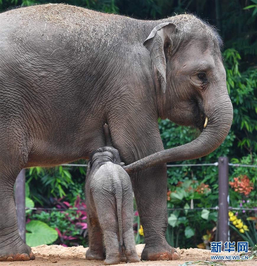 5月27日,广州长隆的新生亚洲象宝宝在吃奶。在不到一个月的时间内,广州长隆野生动物世界的亚洲象家族迎来两名新丁。4月30日,亚洲象莉娜产下一头公象,出生时体重88公斤;5月12日,亚洲象伊拉产下一头母象,出生体重达108公斤。大象妈妈莉娜和伊拉均为长隆野生动物世界亚洲象种群繁育基地繁殖的亚洲象。至此,长隆亚洲象家族已繁衍至第三代,现共有27头大象。新华社记者刘大伟摄