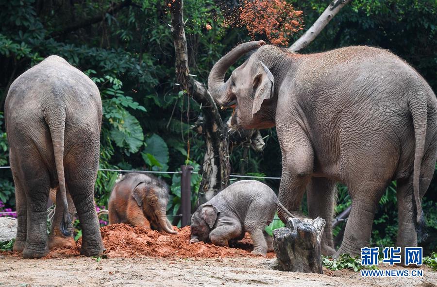 5月27日,广州长隆的两只新生亚洲象宝宝在妈妈的陪伴下玩耍。新华社记者刘大伟摄