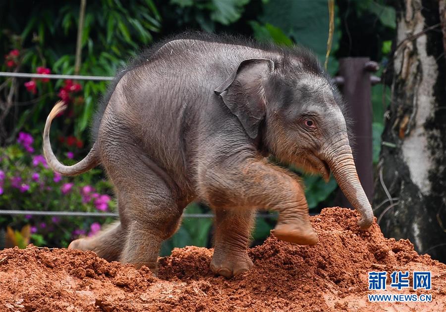 5月27日,广州长隆的新生亚洲象宝宝在红泥堆玩耍,这些泥土可以帮助大象护理皮肤和补充盐分。新华社记者刘大伟摄