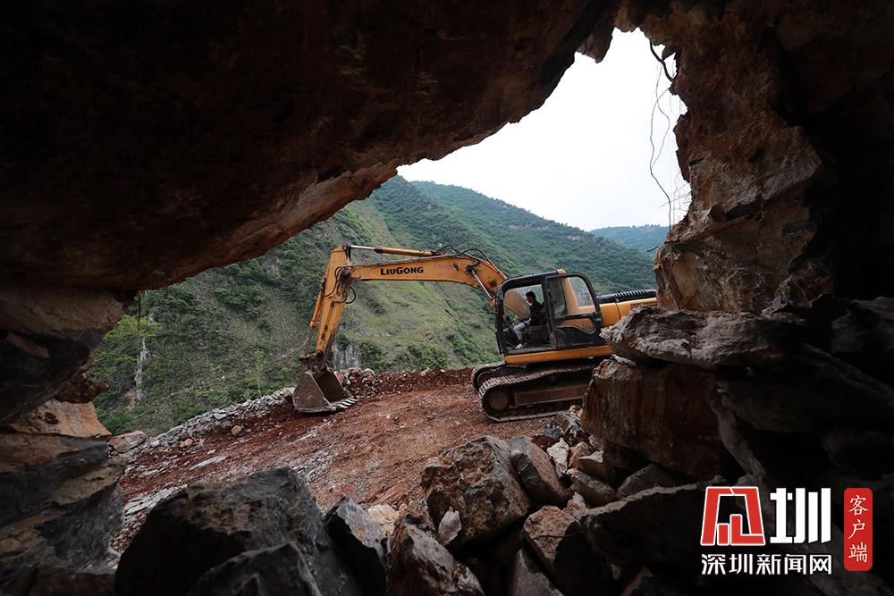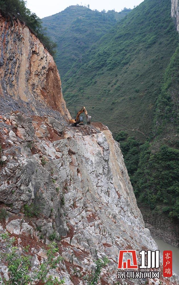 2020年5月27日,在贵州省毕节市纳雍县化作乡双岩头村,挖掘机在观音岩的悬崖边修路。
