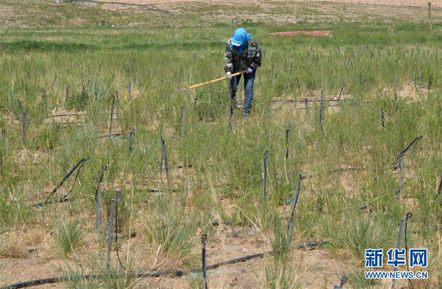 5月28日,工人在巴丹吉林镇生态修复项目南部河道附近进行补植作业。2017年以来,内蒙古阿拉善右旗在巴丹吉林镇开展生态修复项目,种植适合在当地生长的马莲、红柳等植物,修复生态的同时也起到美化作用。巴丹吉林镇是巴丹吉林沙漠旅游景区的游客集散地,这里常年干旱少雨,水资源匮乏。新华社记者徐钦摄