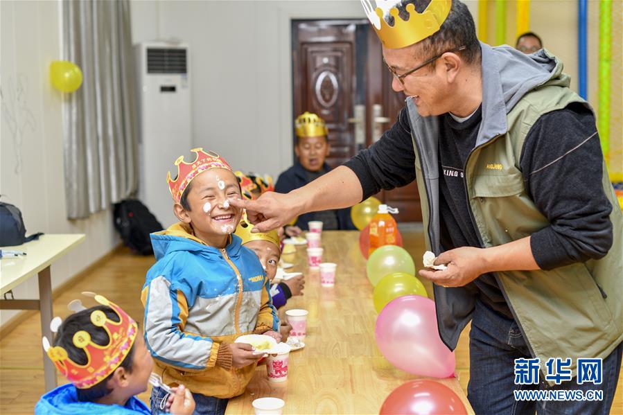 5月27日,玉麦乡小学校长朗杰和孩子们一起庆祝“生日”。新华社记者王炳坤摄