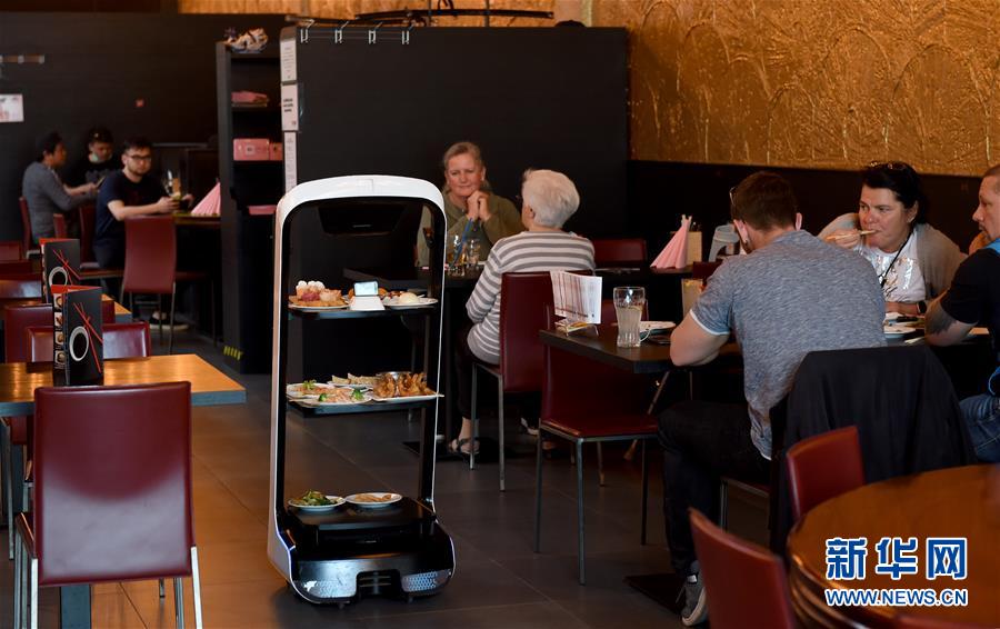 5月28日,在奥地利维也纳一家亚洲餐厅内,机器人给顾客上菜。维也纳的一家亚洲餐厅于疫情期间重新营业后,更多利用机器人上菜,以减少服务员和顾客之间的非必要接触。新华社记者郭晨摄
