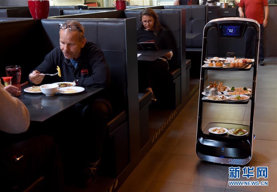 5月28日,在奥地利维也纳一家亚洲餐厅内,机器人给顾客上菜。维也纳的一家亚洲餐厅于疫情期间重新营业后,更多利用机器人上菜,以减少服务员和顾客之间的非必要接触。新华社记者郭晨摄