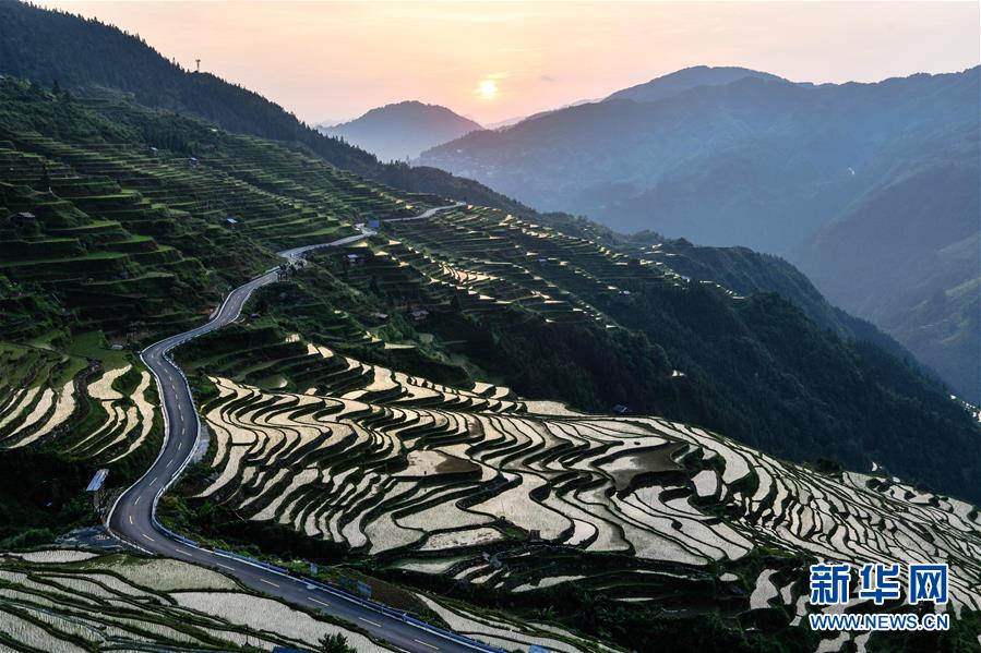 晨光中的从江县加榜乡加车梯田(5月28日摄)。夏日时节,位于贵州省黔东南苗族侗族自治州从江县加榜乡加车、加页、党扭等苗寨的梯田在晨雾与阳光的映衬下线条分明,光影变幻,景色如画。新华社记者 杨文斌 摄