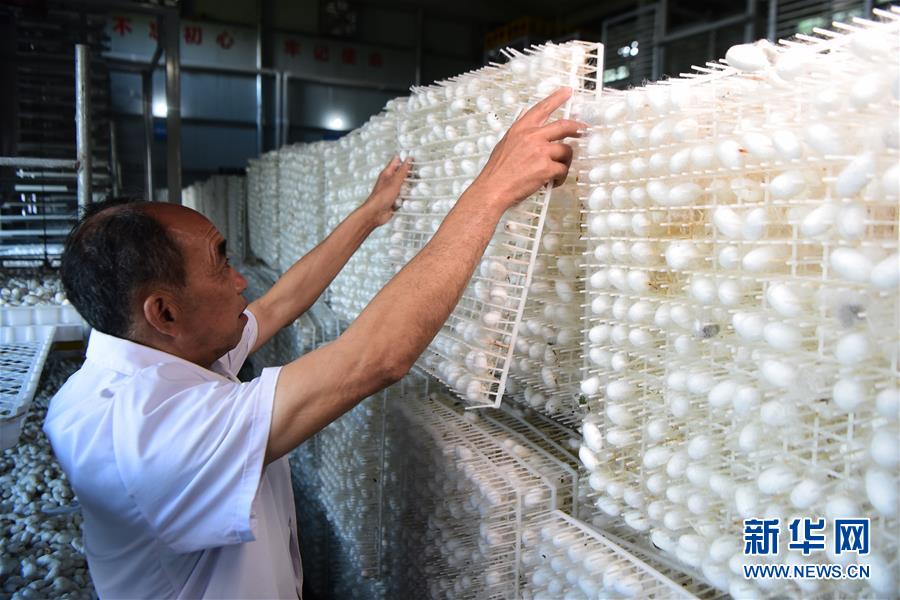 5月29日,奉节县新民镇中岭村蚕桑产业扶贫基地工作人员在智慧蚕房内晾晒蚕茧。新华社记者 王全超 摄