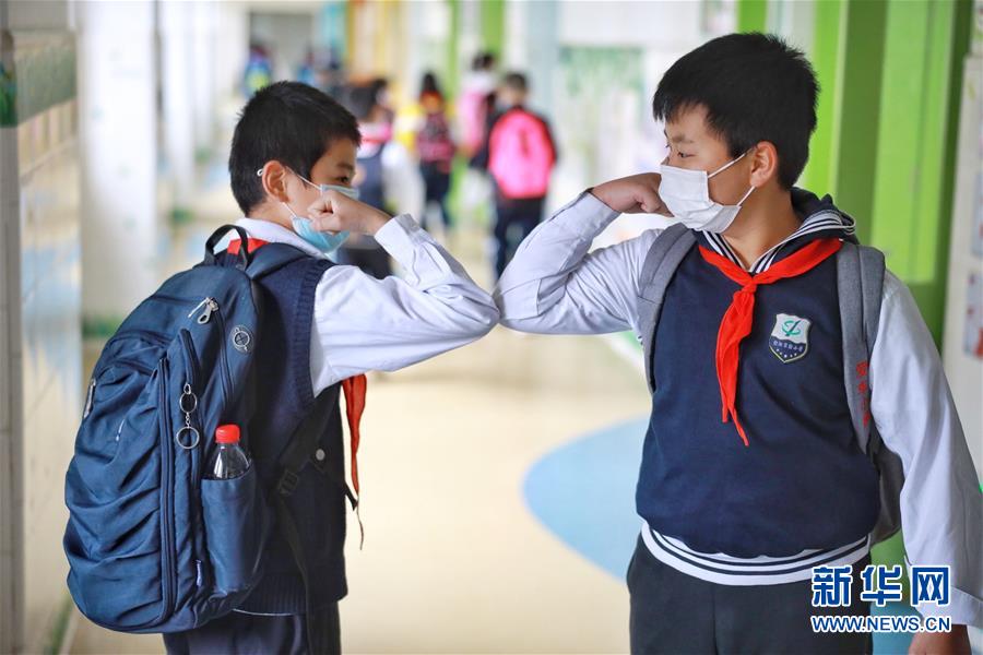 贵州贵阳,小学复课,两名学生用“碰肘”的方式打招呼(5月25日摄)。新华社记者刘续摄