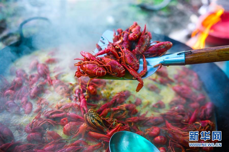5月30日,厨师在龙虾狂欢节现场烹制小龙虾。