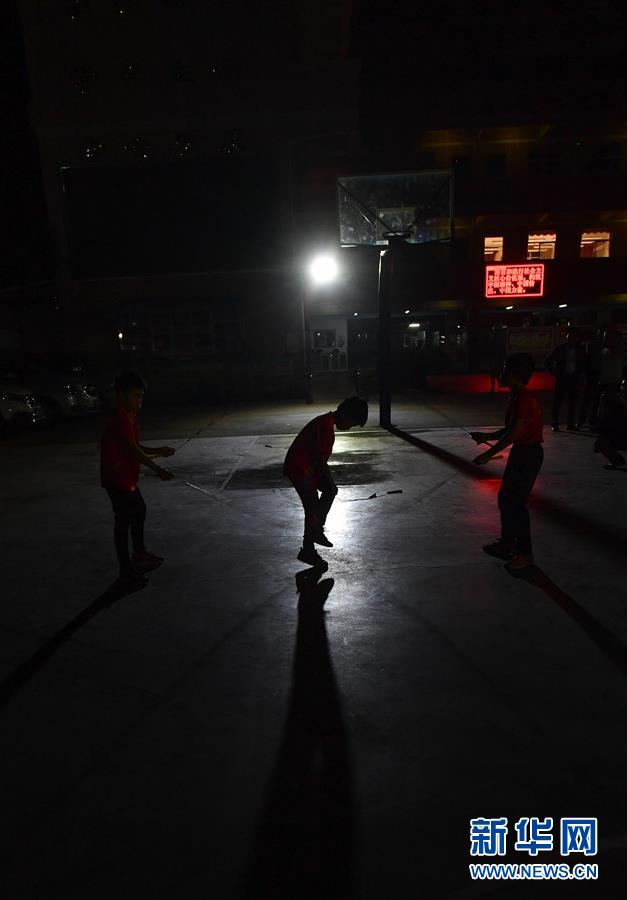 钟炜锋在校园小广场上和同学练跳绳,当天晚上,电影《点点星光》将在七星小学操场上举行首映式(2019年11月15日摄)。新华社记者刘大伟摄