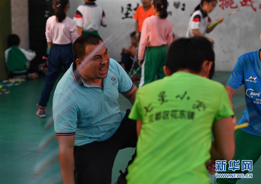 七星小学跳绳队教练赖宣治(左)正大吼着激励队员训练。正是这位没有接触过专业跳绳训练的的体育老师把跳绳运动引入学校,十年不懈,领着孩子们从乡村的小操场跳到世界的大舞台(2019年11月18日摄)。新华社记者刘大伟摄