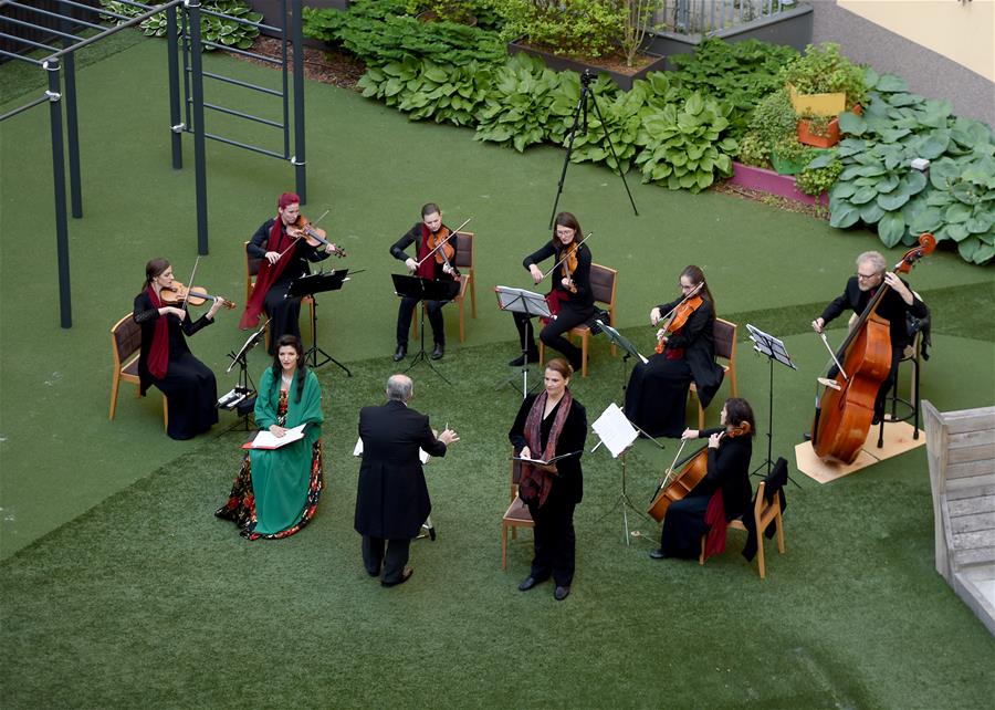5月30日,在奥地利维也纳“时代精神”酒店的庭院内,歌剧乐团为观众演出。当日,奥地利首都维也纳的一家名为“时代精神”的酒店为迎接“解封”后恢复营业,在其庭院内举办“窗口音乐会”。按照奥政府此前公布的“解封”时间表,从29日起,宾馆酒店以及健身房、游泳池和游乐场等休闲娱乐场所有条件恢复运营。新华社记者郭晨摄