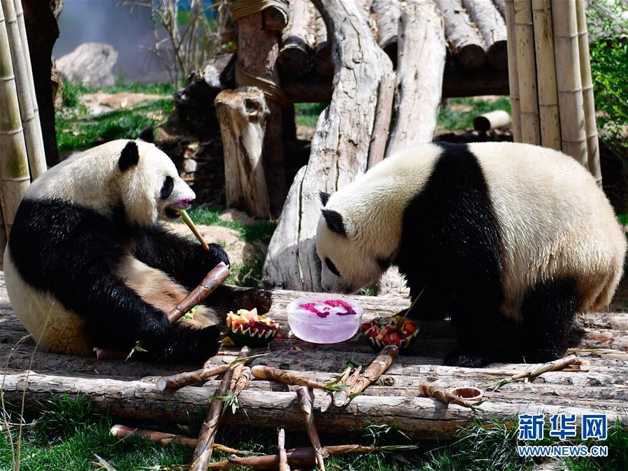 5月31日,两只大熊猫在享用儿童节“大餐”。新华社记者张龙摄