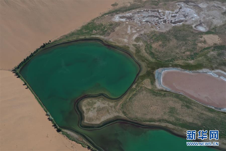 这是5月30日拍摄的巴丹吉林沙漠一处湖泊(无人机照片)。新华社记者徐钦摄。