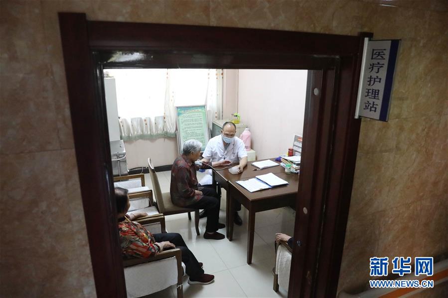 6月1日,在正定县塔元庄村劲松老年公寓,医护人员在医疗护理站为老人测量血压。新华社记者朱旭东摄。