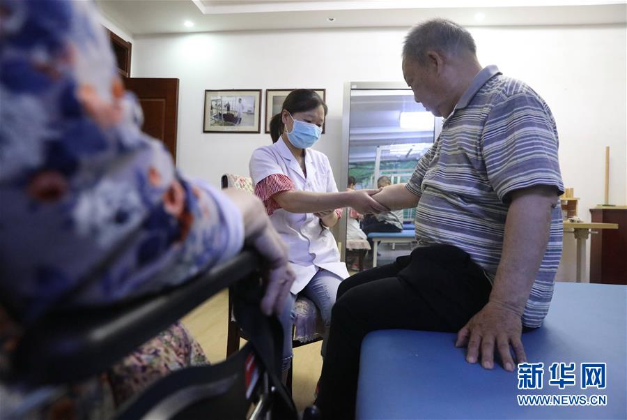 6月1日,在正定县塔元庄村劲松老年公寓,医护人员为老人做康复按摩。新华社记者朱旭东摄。