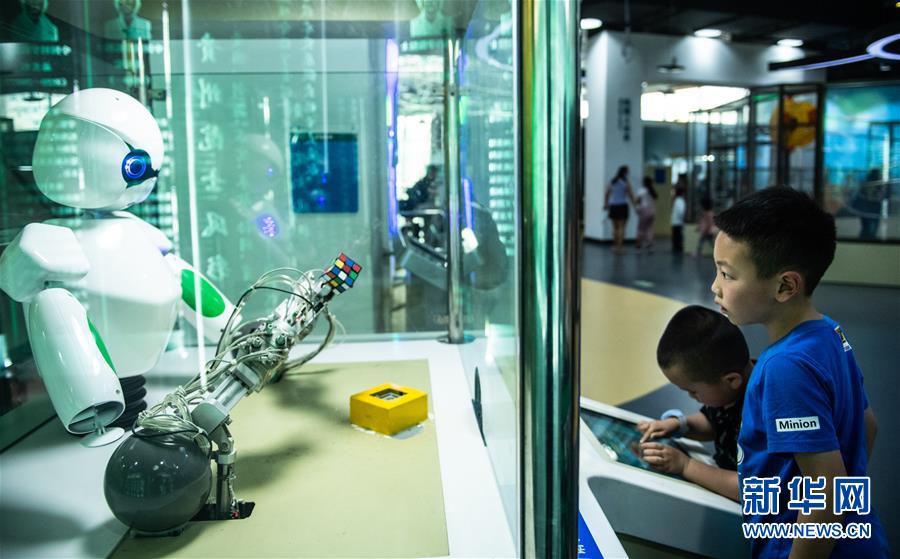 6月1日,小朋友在贵州科技馆内操作机器人旋转魔方。新华社记者陶亮摄。