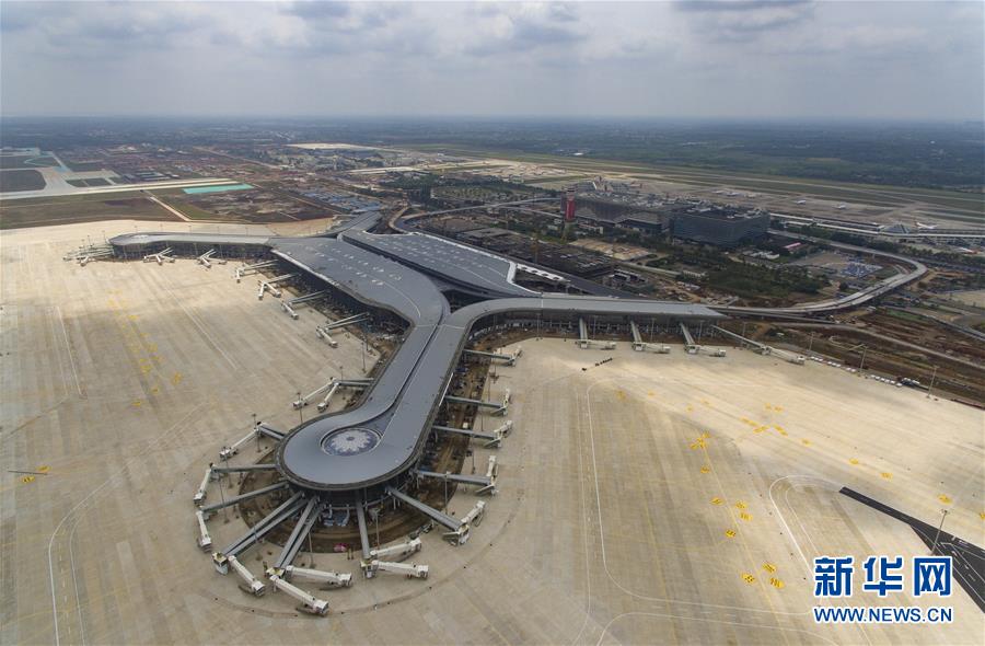 这是4月11日拍摄的建设中的海口美兰国际机场二期项目航站楼(无人机照片)。新华社记者郭程摄