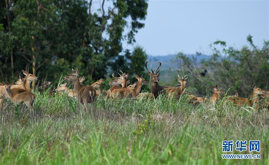 一群坡鹿在海南邦溪坡鹿自然保护区内休憩(4月3日摄)。新华社记者杨冠宇摄