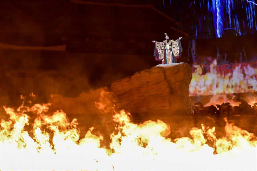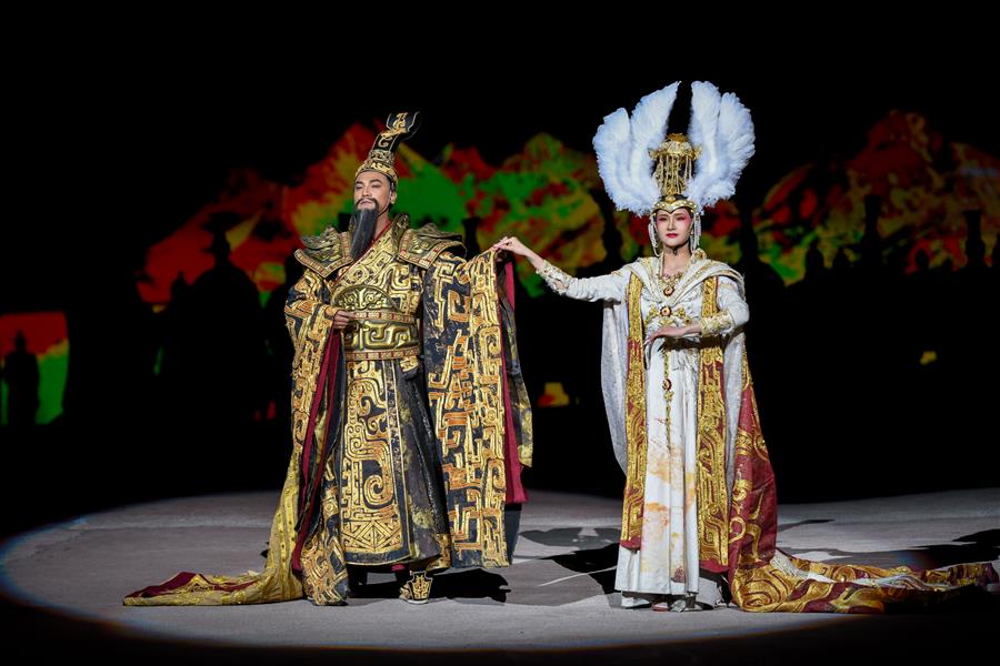 5月28日,演员在大型实景神话音乐剧《昆仑之约》中表演。5月28日,新疆文化旅游新名片——大型实景神话音乐剧《昆仑之约》在乌鲁木齐南山景区上演。该剧融自然山水之美、艺术文化之光、现代科技之新于一体,为市民献上一场视听盛宴。新华社记者丁磊摄。