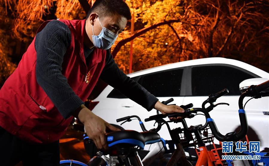 杨龙明将搬出小区的共享单车摆放整齐(6月1日摄)。新华社记者李然摄。